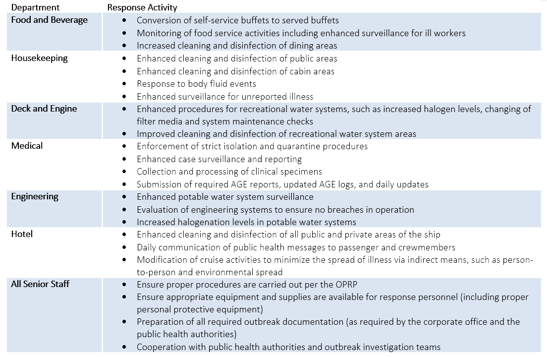 “Before the occurrence of an outbreak, it is critical to establish strategies for intervention. Since the publication of the 2005 version of the Operations Manual, the VSP requires that all ships have a written Outbreak Prevention and Response Plan (OPRP). The main objective of the plan is to establish coordinated response procedures to minimize morbidity (illness) and possible mortality (death) in both passengers and crew populations. These plans describe the response actions to be taken by each department during a shipboard outbreak of acute gastroenteritis. The plan establishes when the response actions occur based on trigger points for phased-in response activities and must increase response action in the face of increasing cases.