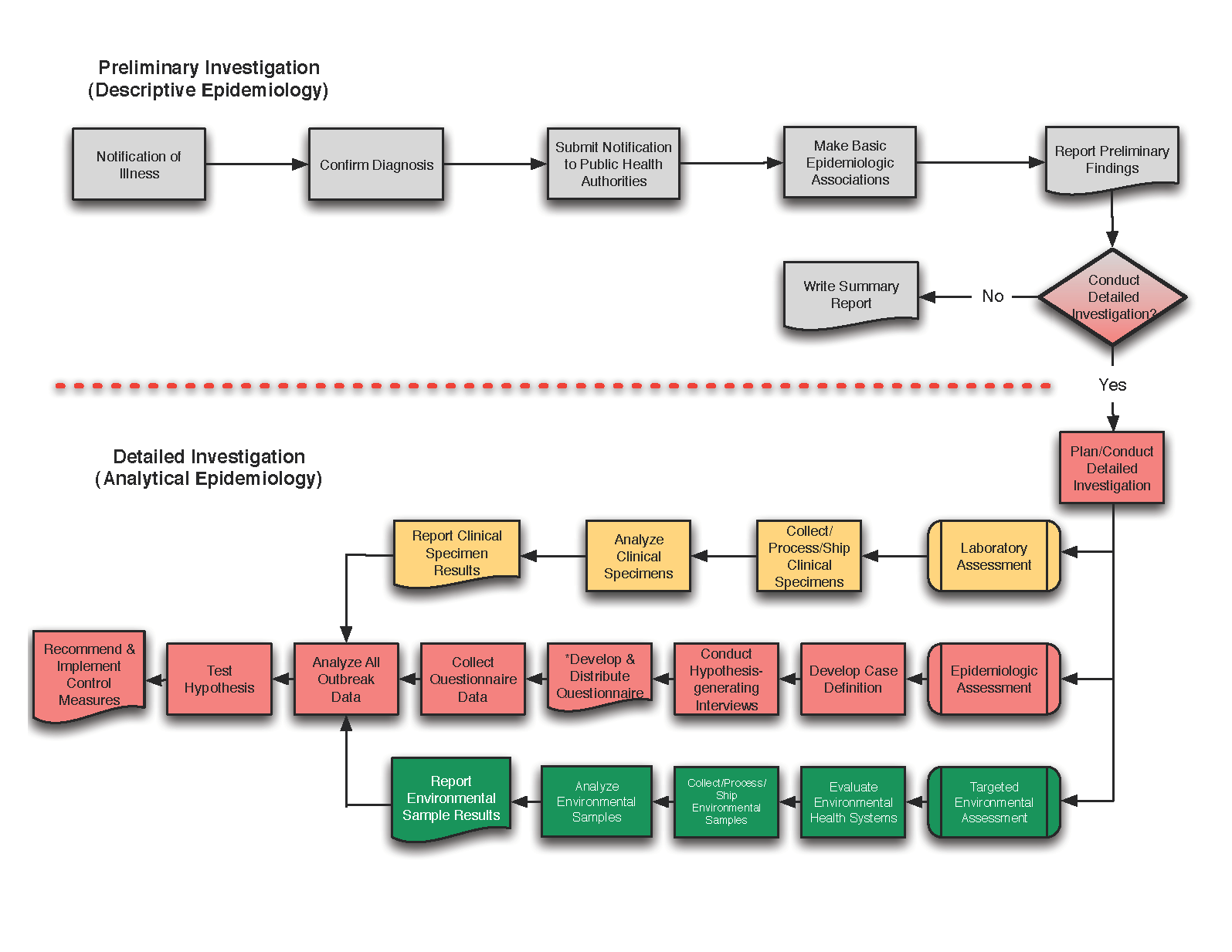 “Certainly. First, let me point out that this flowchart was designed to be a broad overview of the necessary steps in an outbreak investigation. An outbreak investigation typically involves many more steps and activities than are outlined here. This flow chart intends to provide appropriate direction to the ship’s staff as to the activities they make undertake when faced with a significant elevation of cases or when they are in the midst of an outbreak.